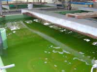 ワムシを与えている間は、ワムシの餌となるナンノクロロプシスという植物プランクトンも一緒に水槽にいれておきます。そのため、水の色は緑色になります。